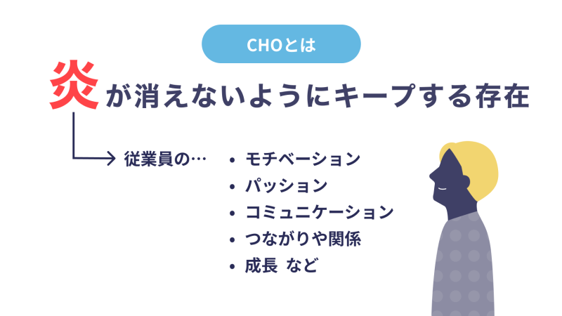 炎とは、従業員の「モチベーション」「パッション」「コミュニケーション」「つながりや関係」「成長」など、さまざまなもの象徴しています。CHOの仕事は炎が消えないように、一貫性を保てる環境を作ったり、社員を支える必要があります。CHOの仕事には、「会社の炎を保つ」という大きな責任があるのです。