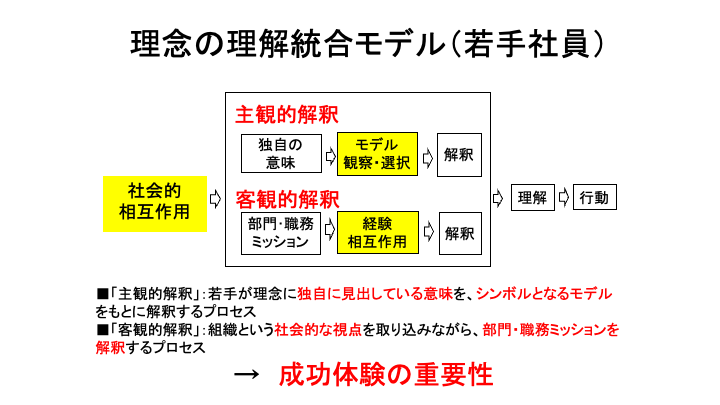 どのような経験が意味づけをもたらすのかは、キャリアによって異なります。例えば、若手社員の場合は、それまでの価値観や志向をもとに、各自が理念に意味を見い出しています。そしてそれに近い言動をとる先輩や上司をシンボルとして観察している。つまり主観的ながらもモデルケースを見ることで、理念の意味を学んでいるのです。