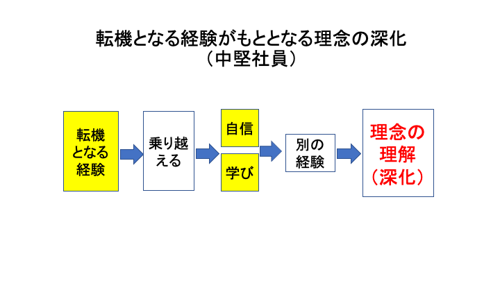 対して中堅社員の場合は、“修羅場”といわれるような痛みを伴う経験(転機となる経験)が必要です。過酷な状況を乗り越えていく過程で達成感や乗り越えた感を味わい、学びや自信を深めるなかで、理念への理解が自分の中に広がっていく。仕事に対する使命感や責任感が、理念の意味や重要性に気づかせてくれるんです。
