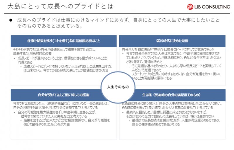 僕が思うのは、死ぬときに自分に問うことは「自分の人生の旅は素晴らしかったったのか?」という問であり、そこに対して「良い人生だった」と答えたいということ。そのために最終目標に対して到達できるかは分からないが、本気で向かっていくということが重要だと考えています。成長に向かって本気であり続けられたか、ということが重要だと思ってるんです。そう意味で僕は‘人間力’という意味での成長を重視しているので、‘成長へのプライド’というのは仕事におけるマインドではなく、仕事におけるスキルが付随してある、という認識でいますね。