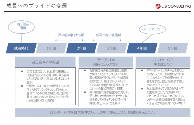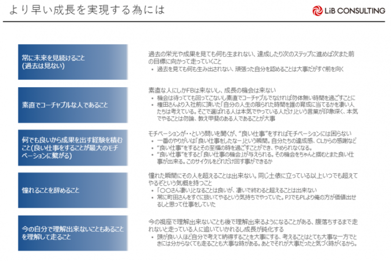 最近はと言うと、もちろんそこは継続してありつつ、ベンチャーグループをLiBの中で背負う立場としてコンサルとではありながらも一方で事業家としての成長ということも源泉になっています。チームを持つということで、メンバーを背負う立場でもありますし、自分が成長することが結果的には事業の成長に繋がるとも思っているので、そこを目指してやっています。