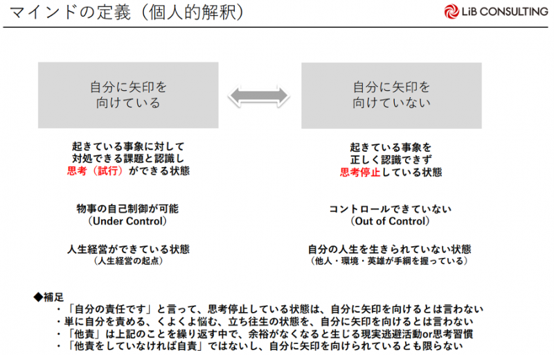 自分自身もそうだし、人に何か伝えるときに一番難しいと思うのは、この志を育てることです。ここが「自分に矢印を向ける」ことの、一番難しいところだと思っています。