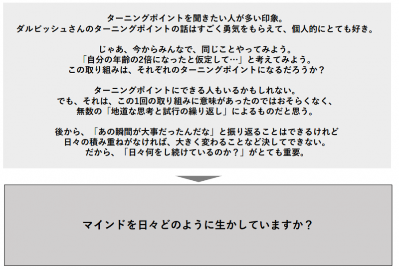 私はこのダルビッシュさんのターニングポイントの話がとても好きで、自分でイメージしたりもするんですが、実際、皆さんこれを今やってみましょう。