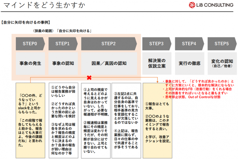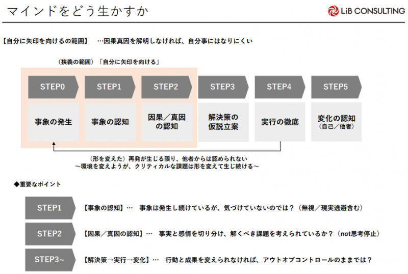 一方で、狭義の自分への矢印はSTEP0~2。事象の発生を認知して、真因の深堀りをしている状態です。