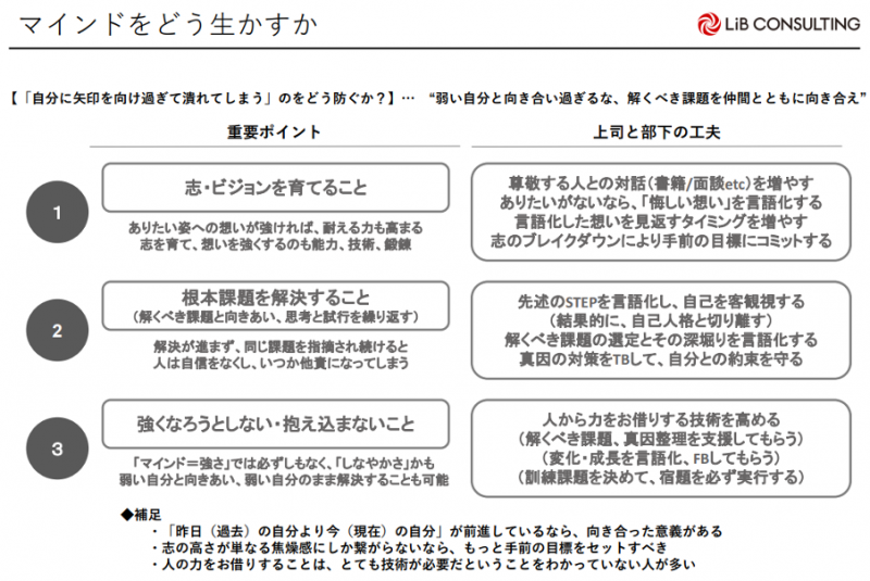 言語化をすることで、上司から見ても、マインドの問題なのか、スキルの問題なのかが分かります。だからこそ、このステップに基づいた”言語化”が重要になります。