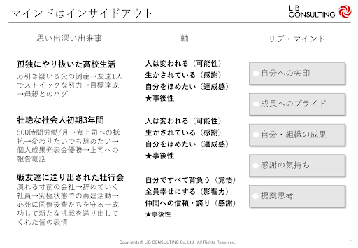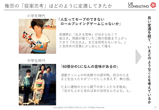私は定期的に、思い出深い出来事を振り返り、自分がどんな軸を大事にしているかを言語化しています。そして、その軸とLiBマインドとを紐づけていくというインサイドアウトのアプローチをしています。そうしたアプローチをするなかで、自分が思う提案思考とは「生きている証」ということだと考えています。なぜ、43年間生きていくなかでここに至るようになったかというのをお伝えしていきたいと思っています。