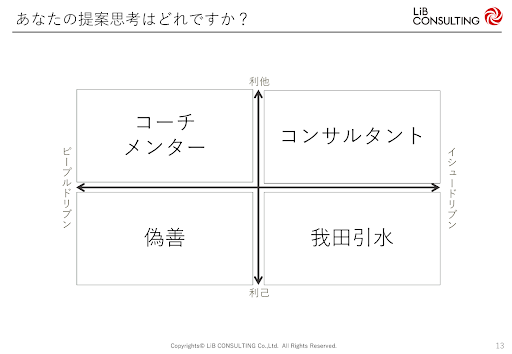 あとは、ほんとにその人のためにと思ってやっている人もいれば、最後は何か自分に戻ってくるということを考えながらやっている人もいると思います。先ほどの提案をするしないの分岐で、提案する方に行ったとしても、さらにこうした分岐があると思います。