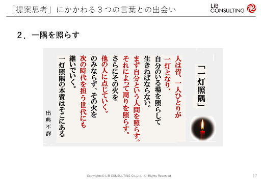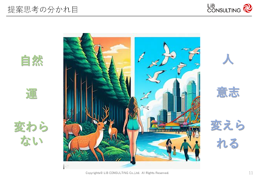 リブ・コンサルティングとしてインパクトカンパニーを作っていくという点でも、提案思考は礎であると思っています。リブ・コンサルティングを通じて、今かもしれないし、10年後、20年後かもしれないですが、その会社さんのBefore→Afterを生み出していくなかでの、時間の流れ方や関わり方は提案思考という考え方から、インパクトカンパニー作りに繋がっていくものなのだろうと思っています。