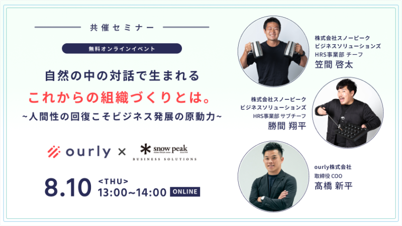 そこで今回は、オフィス空間デザインやアウトドア研修、さらには企業のDX支援を提案する株式会社スノーピークビジネスソリューションズ様にご登壇いただき、自然とデジタルの融合の先にある人間らしい働き方について徹底解説していただきます!