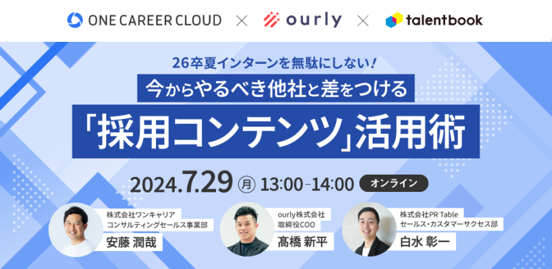 新卒採用最大級の就活サイト「ONE CAREER」を運営するワンキャリア、組織内の理念浸透やエンゲージメント向上を実現する社内報サービス「ourly」を提供するourly、そして「働く人」から企業の魅力を伝える採用ブランディングサービス「talentbook」を提供するPR Tableの3社がそれぞれの専門性を活かし、包括的な採用広報戦略をお伝えします。